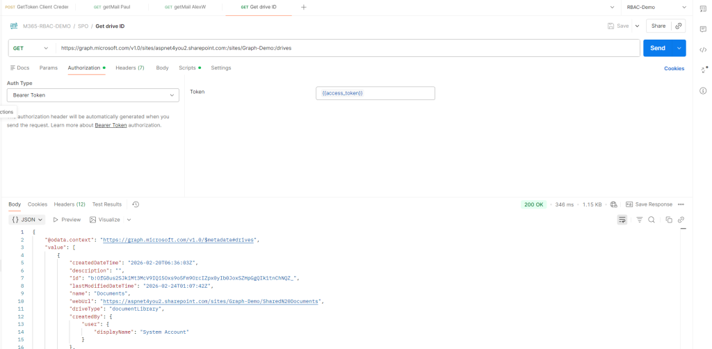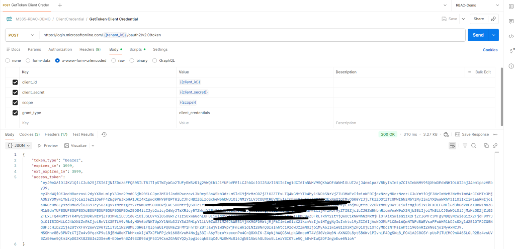 • Acquire Access Token from Entra ID using Client Credential flow. Save the access token in environment variable so we can use it to make graph calls.